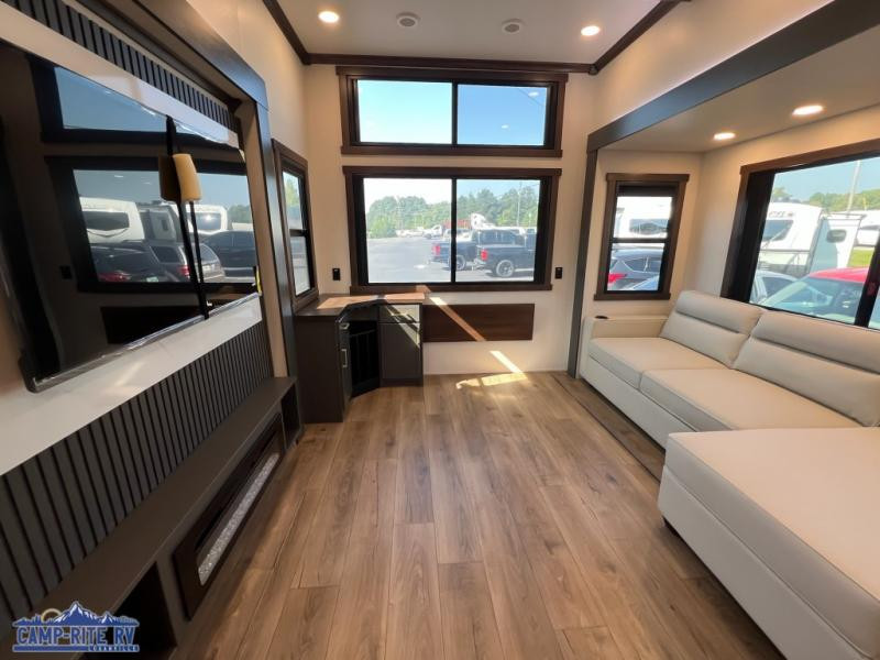 Four slide-outs expand the interior to 459 square feet, comparable to a studio apartment. The 38-inch entrance door opens into a dedicated mud room—practical for families storing outdoor gear after hiking Fort Mountain trails or kayaking Lake Lanier.